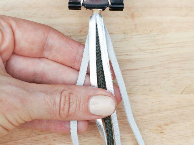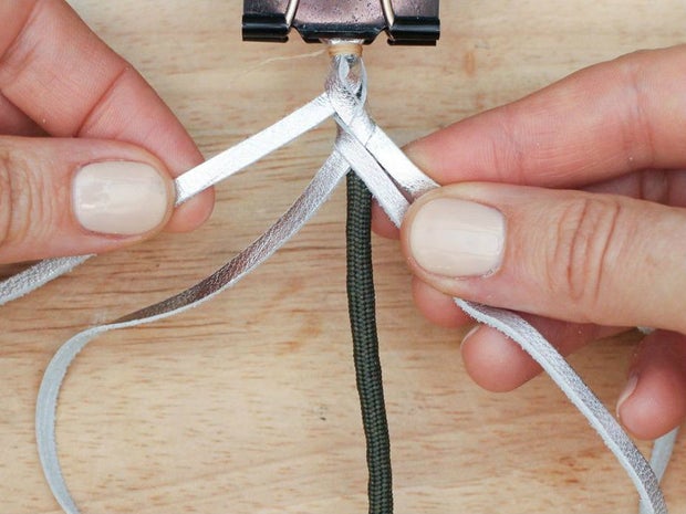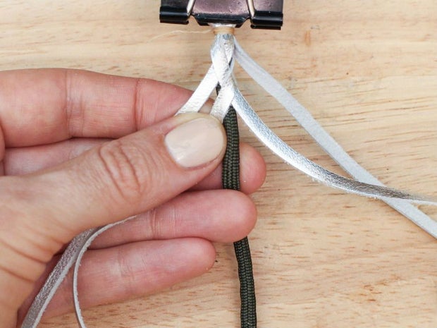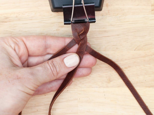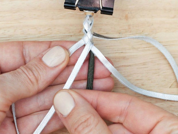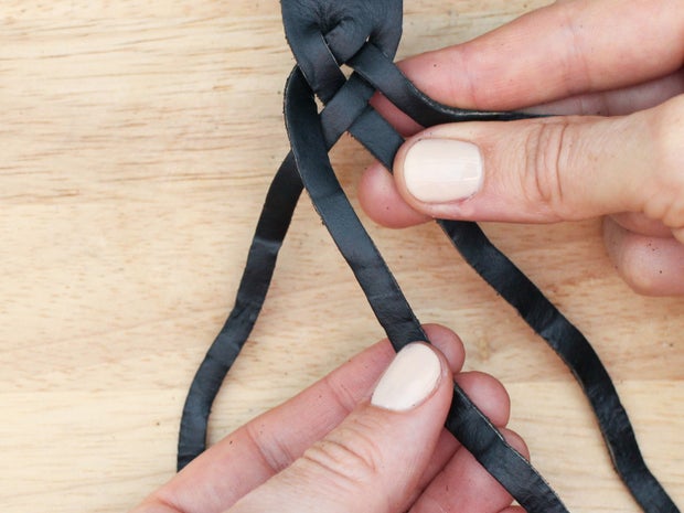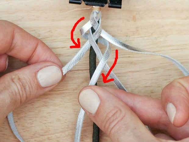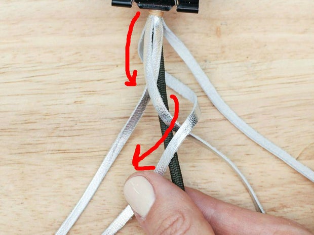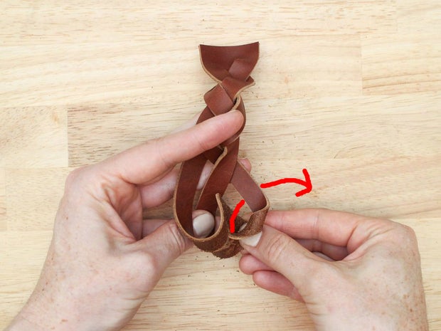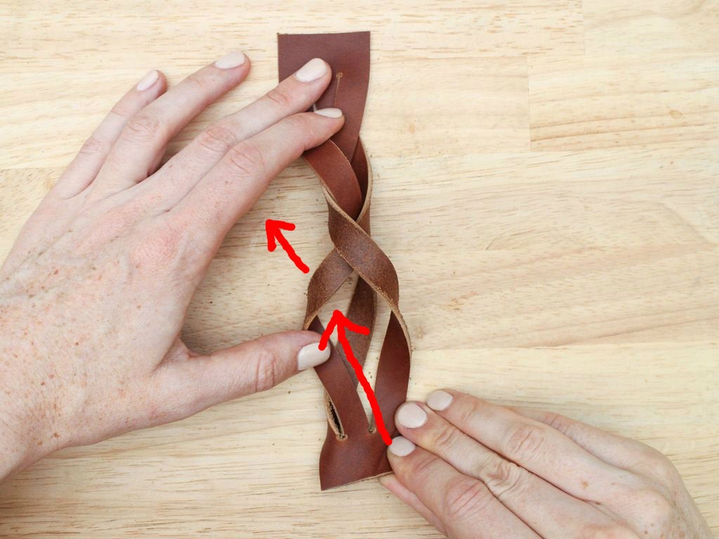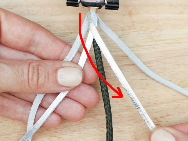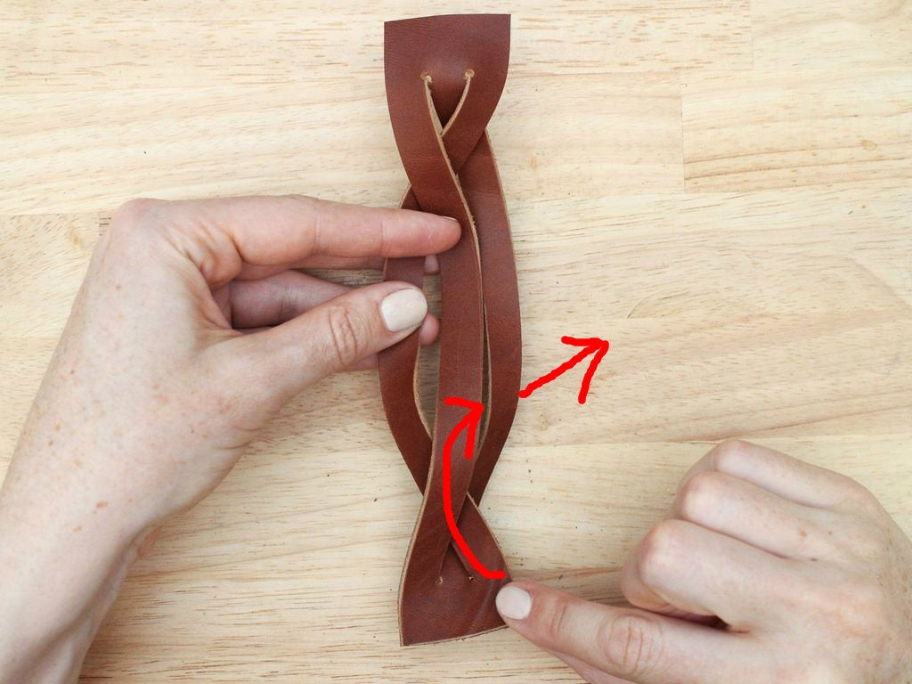 To do this, grab the bottom right hand corner of the leather, fold it up and thread it between the two strands that are currently farthest to the right.