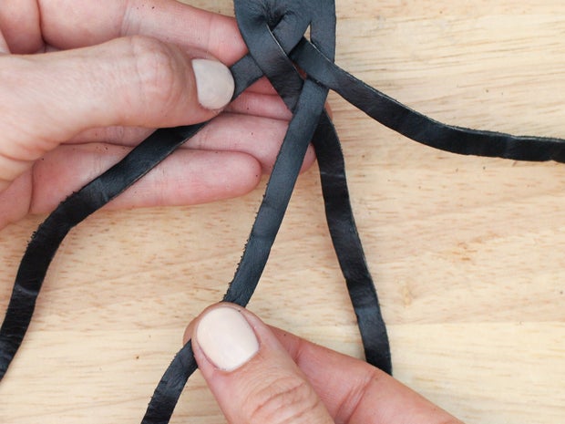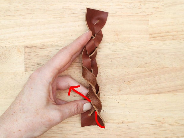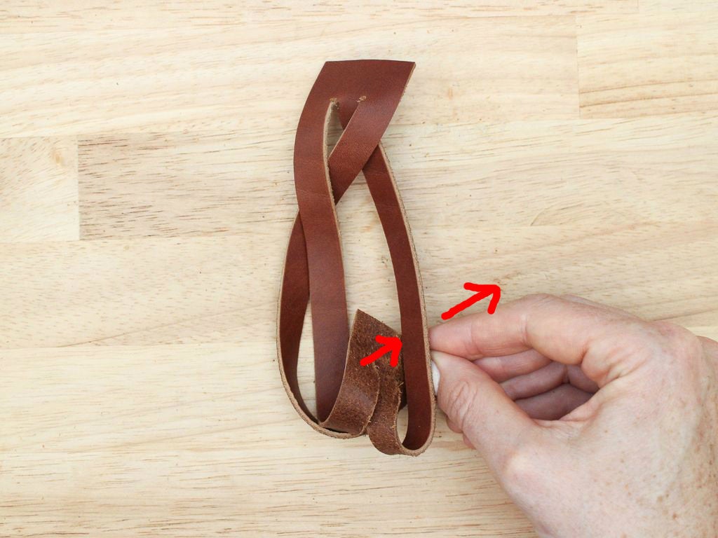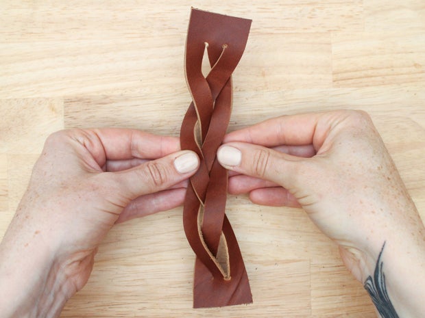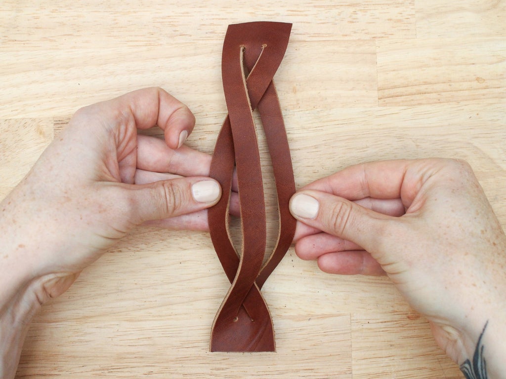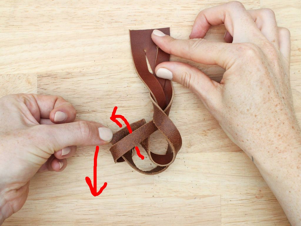 Pull it all the way through and twist it so the grain side is facing up again. You will have created something that looks a bit messy, with a lot of twists in the strands. Don't panic.