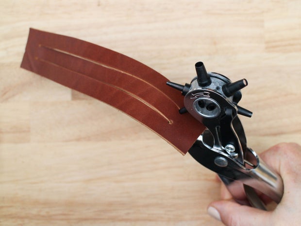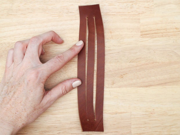 To make this braid, start by cutting three strands out of a strip of leather like you did for the 3 strand braid, but leave them connected at both ends. If you are using thick or stiff leather, it is a good idea to punch a hole at the beginning of each cut to make them cross over each other more smoothly.
