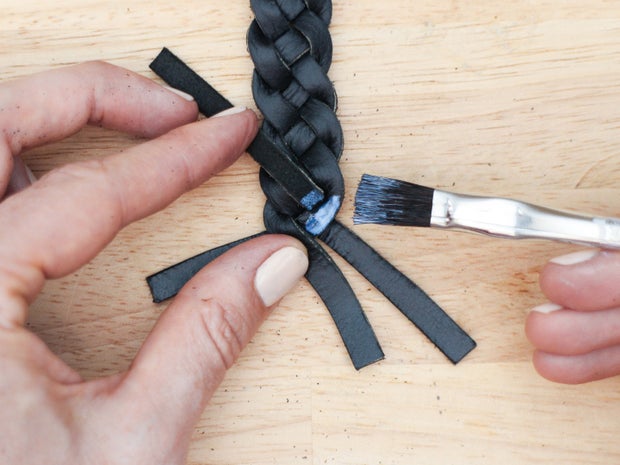 First apply glue to the individual strands of the braid, or punch holes in them and sew them together.