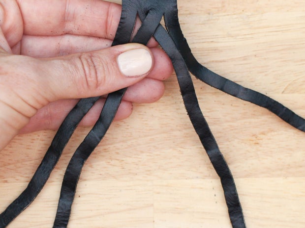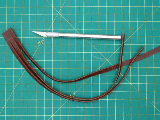 To make leather braids, one of the easiest ways is to start by using one of the fringe cutting techniques I talk about in my How to Make Leather Fringe Instructable, and then braid the cut strips together. This is a nice way to create a braid, because it means that, on one end of the braid, the individual strips are already attached and won't need to be held in place by another finishing method.