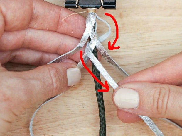 As you can see, you are basically always taking the highest strand from alternating sides, and wrapping it around the back of the rope to the other side and under the next highest strand. Keep working in this pattern to make the rest of the braid. Always keep the grain sides of the lacing facing out and don't let them twist.