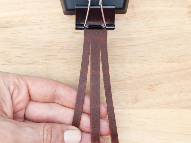 To make the basic braid, cut a three stranded fringe, then find a way to hold the top end in place so you can braid more easily. I like to use a binder clip and then loop the handles around something.